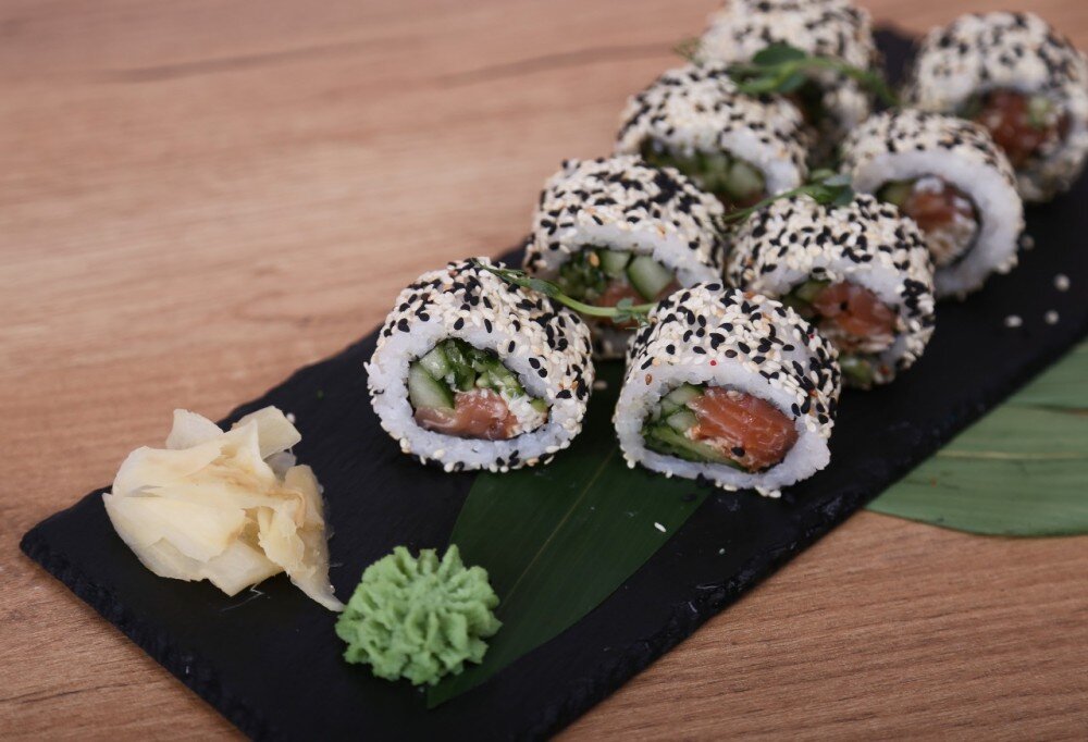 Нори, рис, лосось, угорь, огурец, японский майонез, чука, кунжут