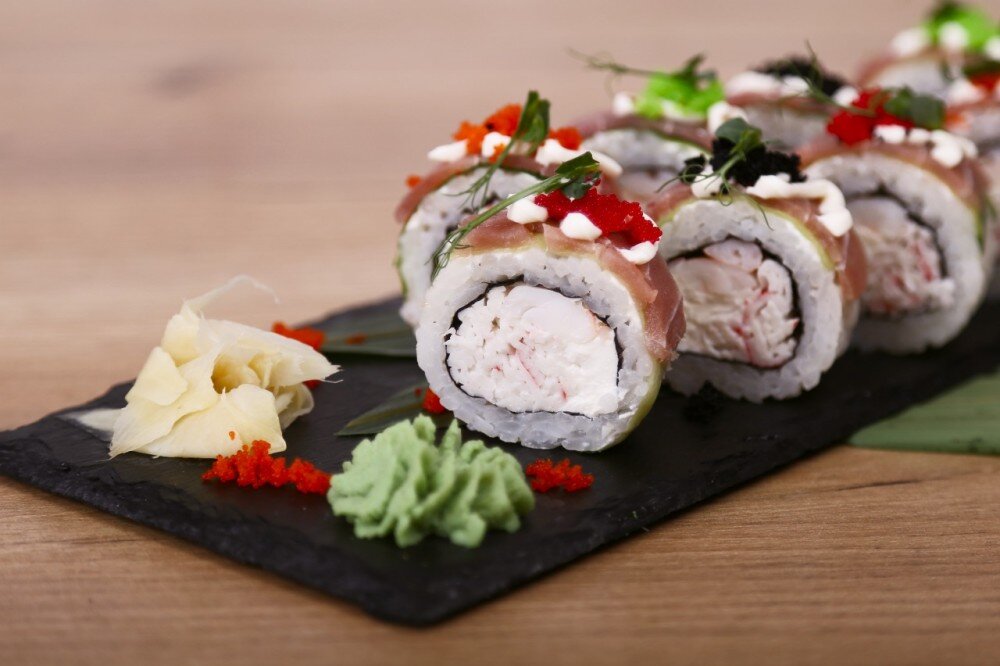 Нори, рис, сыр сливочный, краб, креветка, авокадо, тунец, масага