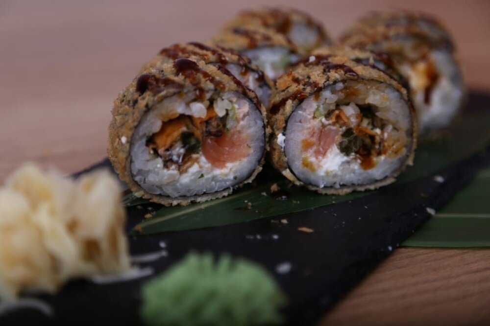 Нори, рис, сыр сливочный, лосось, мидии, огурец