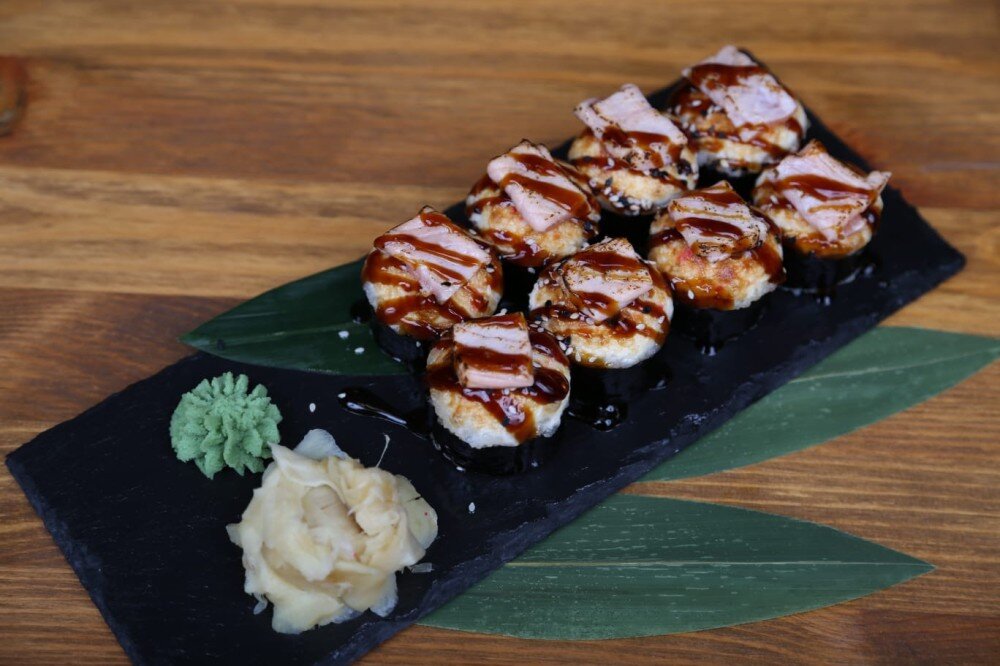 Нори, рис, спайси, краб, мидии, огурец, лук, лосось