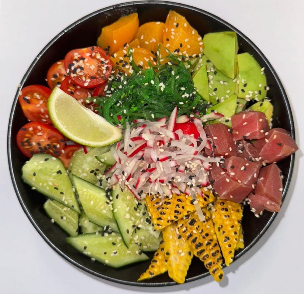Рис, тунец, авокадо, манго, ледяной гриб, огурец, ребис, чука, кунжут, ореховый соус