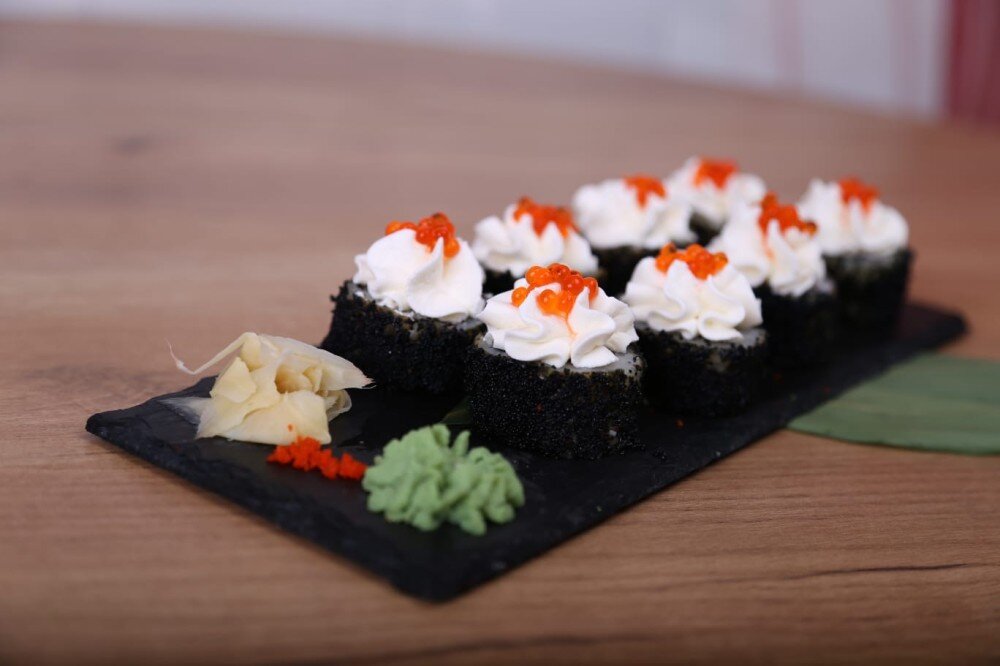Нори, рис, краб, сыр сливочный, огурец, авокадо, масага, майонез японский